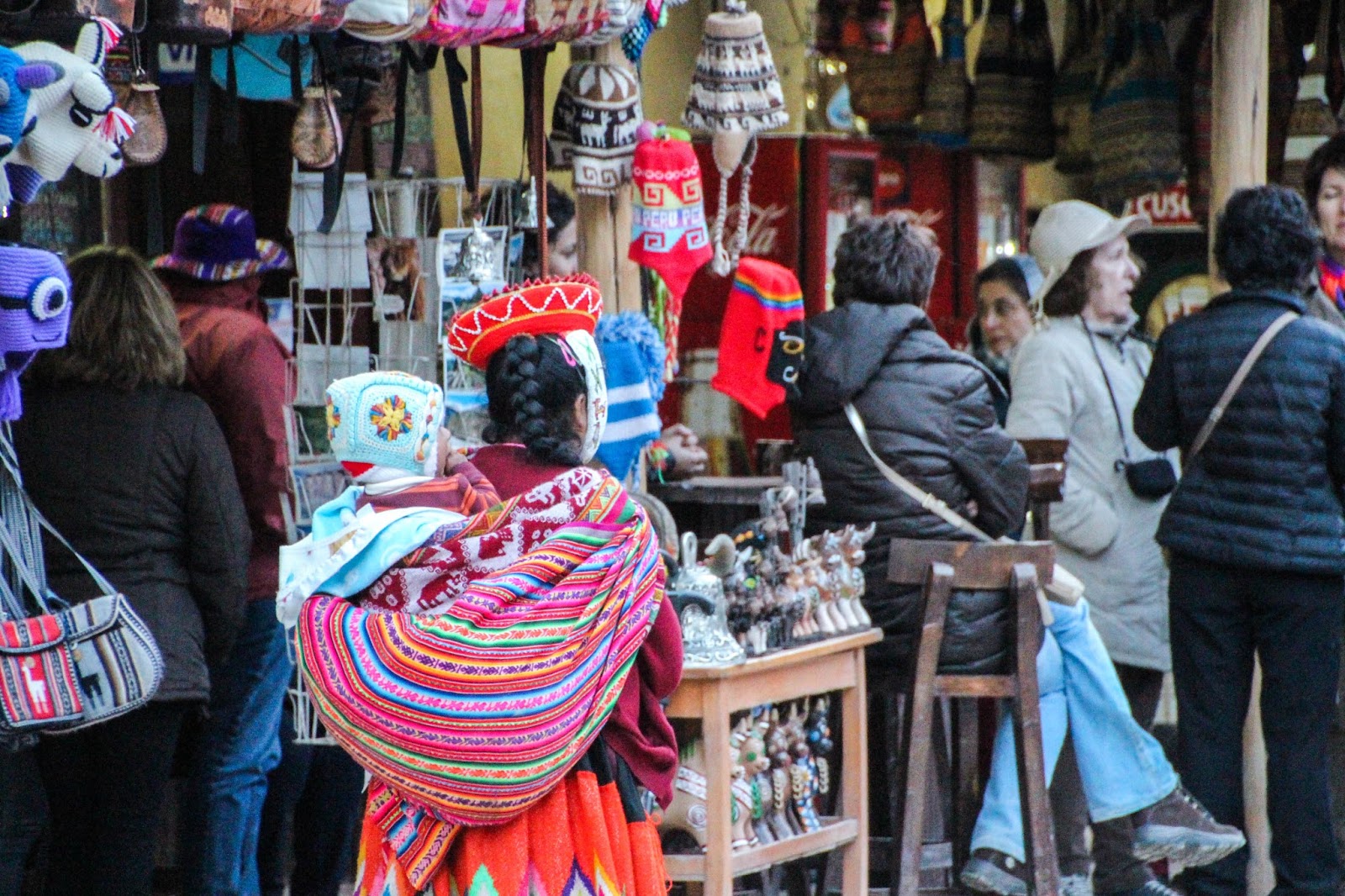 | 秘魯婦女很喜歡這樣背著小孩,有時還背上貨物,所以她們是流動性很高的小販呢~ |